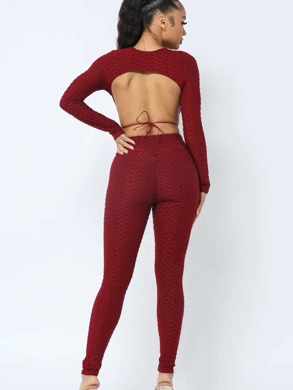Honeycomb Poly Jacquard Open Back Tie Long Sleeve Top and Leggings Set Model: 5' 7, Bust 35, Waist 27, Hips 37.6