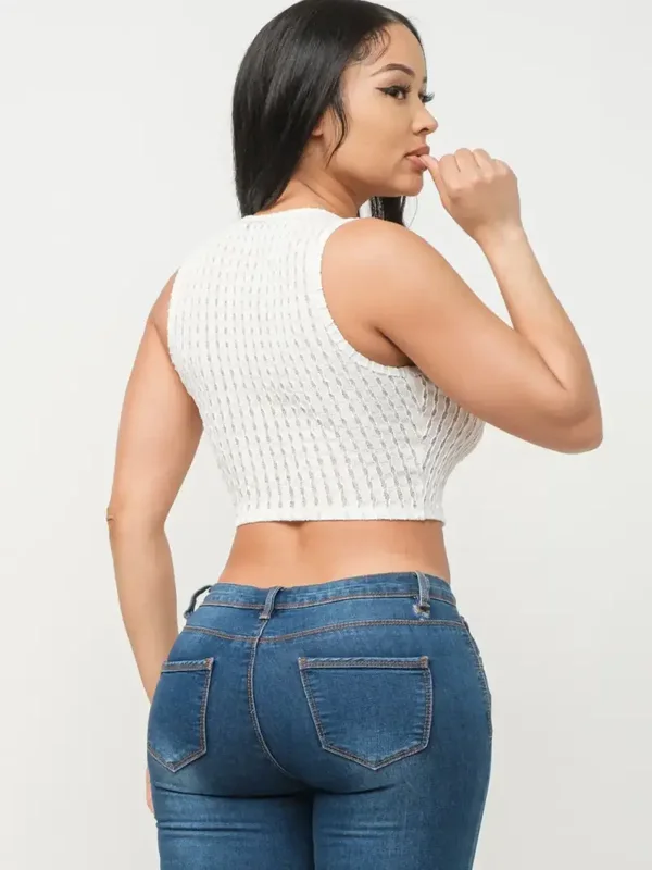 Sleeveless Round Neck Solid See Through Wavy Texture Knitted Detail Crop Tank Top
